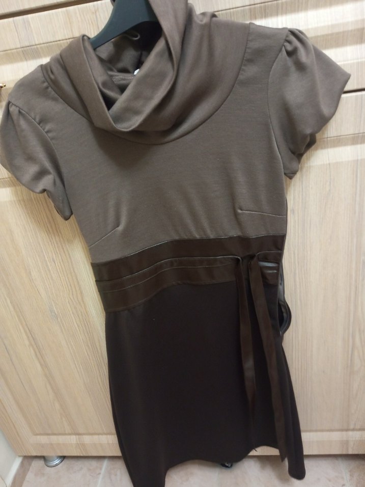 Kahverengi, kemerli, midi boy, kısa kollu, balıkçı yaka ve yumuşak sentetik kumaştan yapılmış dar kesim elbise. Günlük sokak stili için uygun.