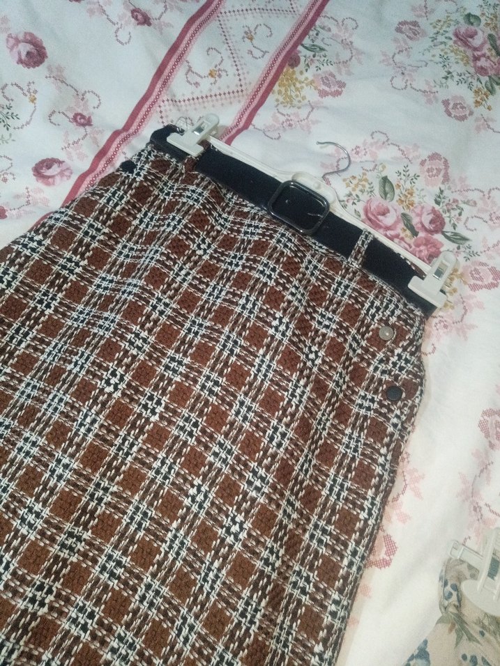 Kahverengi kemerli midi kadın etek, normal kesim ve koyu renkli sentetik kumaştan yapılmıştır. Günlük kullanım için uygundur. kışlık