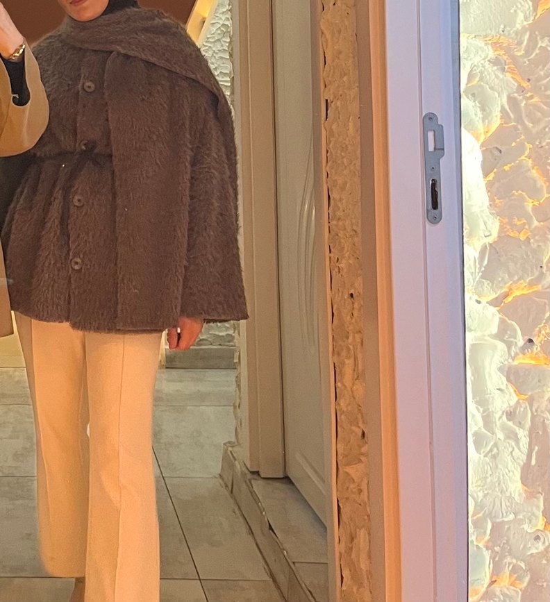 Kahverengi, etnik desenli, bol kesim yün kaban. Uzun kollu ve boğazlı, kemerli tasarımıyla sade ve şık bir görünüm sunar.