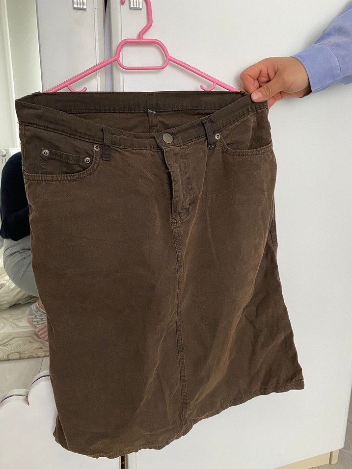 Kahverengi kot kumaştan, kemerli ve bol kesim midi etek, günlük rahatlık ve şıklık sunar.