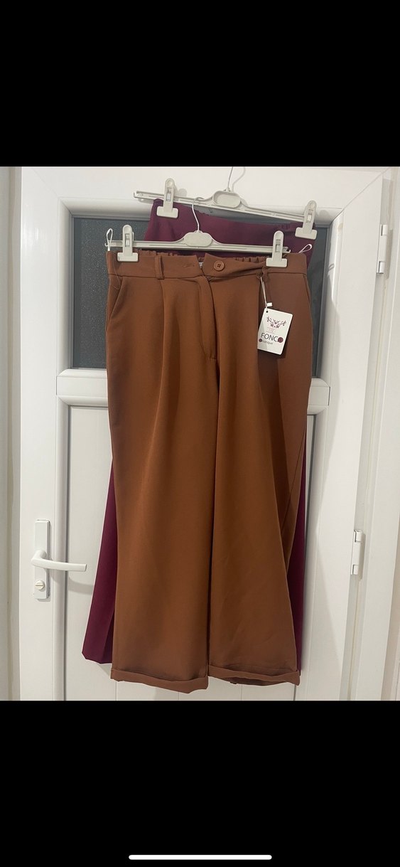 Kahverengi kumaş pantolon, regular fit ve kemerli bel detayına sahiptir. Sade tasarımıyla ofis ve günlük kullanıma uygundur.