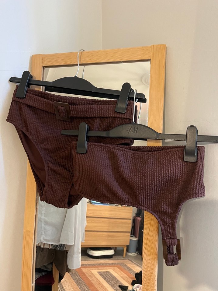 Dar kesim, kahverengi kemerli mini bikini takımı. Askılı üst ve kısa alt kombini, üst bikini M beden alt bikini L bedendir.