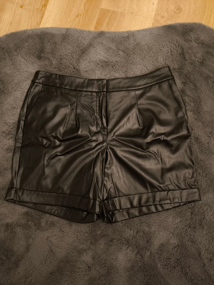 Koyu kahverengi, kemerli ve dar kesim mini deri şort, sokak stiline uygun dış mekan kullanımı için idealdir.