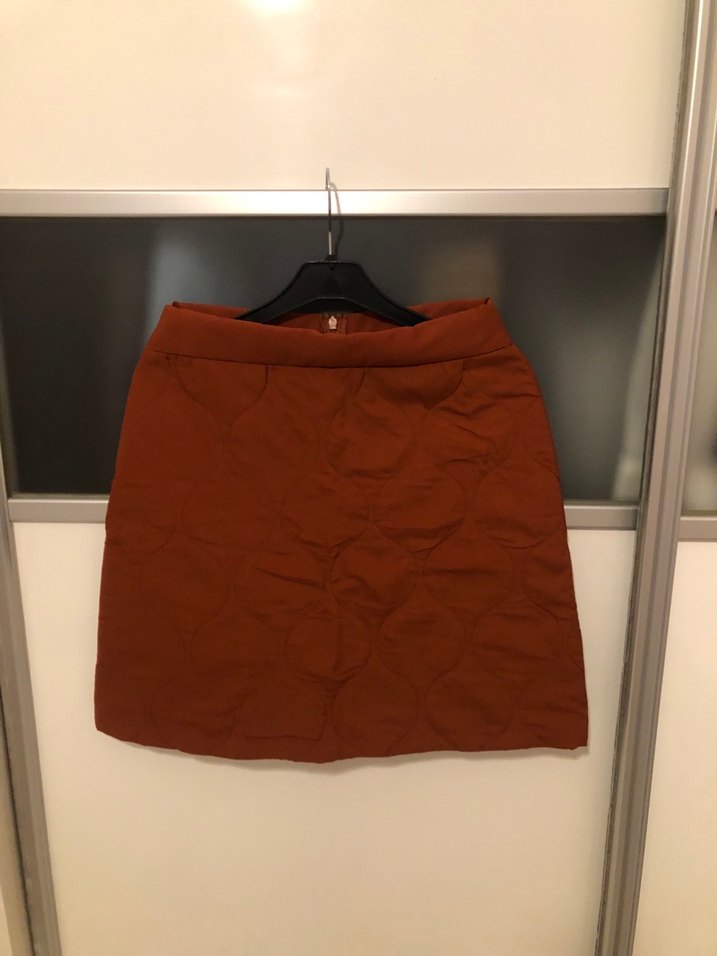 Koton kumaştan yapılmış, kemerli ve bol kesim koyu kahverengi mini etek. Sokak stili ve günlük kullanım için uygundur.
