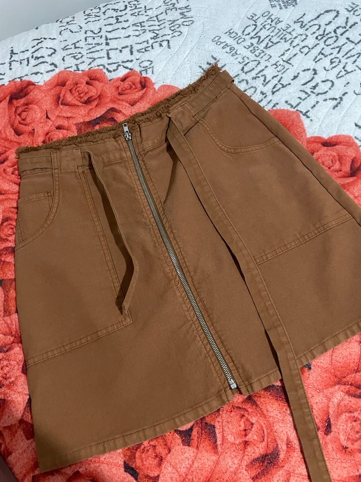 Kahverengi, kemerli ve fermuarlı bu mini etek bol kesimdir. Yumuşak sentetik kumaştan yapılmıştır, günlük sokak stiline uygundur.