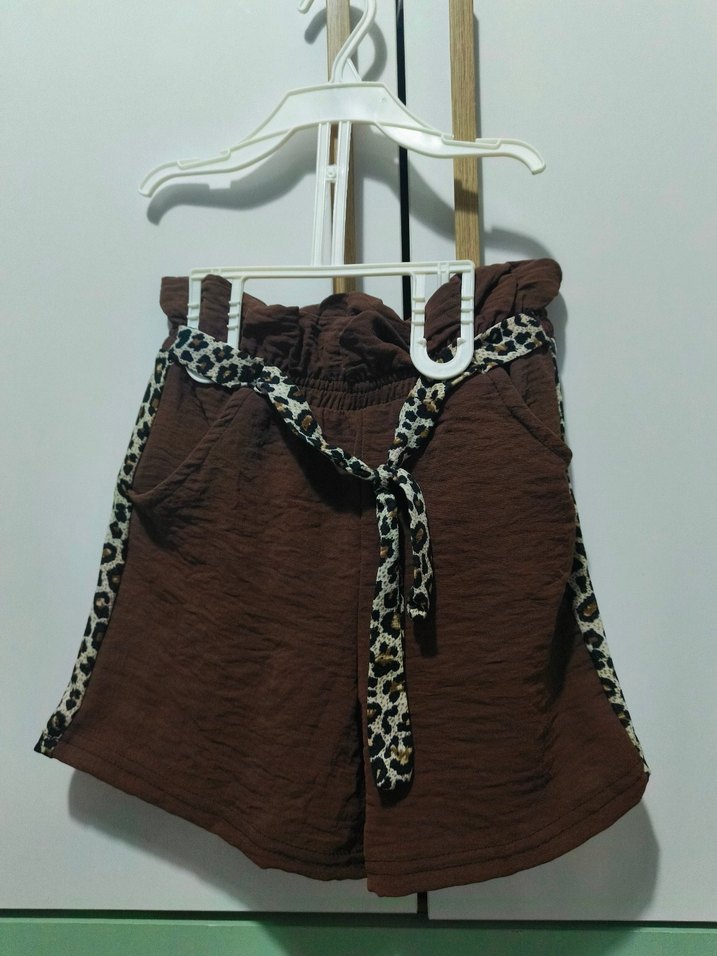 Yumuşak keten kumaştan, bol kesim kahverengi mini şort, leopar desenli kemerle bohem ve rahat sokak tarzı sunar.