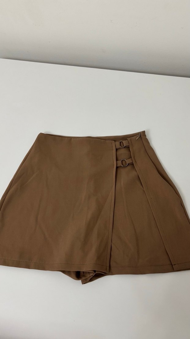 Sentetik kumaştan, kemerli, bol kesim, koyu bej midi mini etek. Minimalist tarzda günlük sokak giyimi için uygundur.