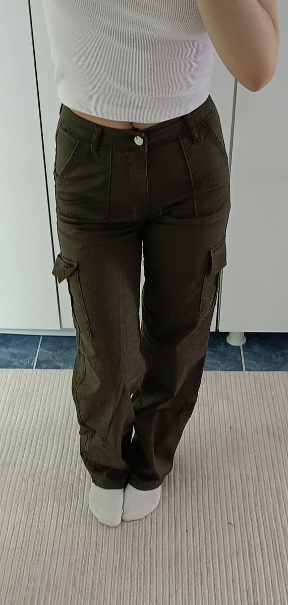 Kahverengi, kemerli ve salaş kesim midi uzunluğunda pantolon. Sentetik kumaştan, sokak stili ve günlük kullanım için uygundur.