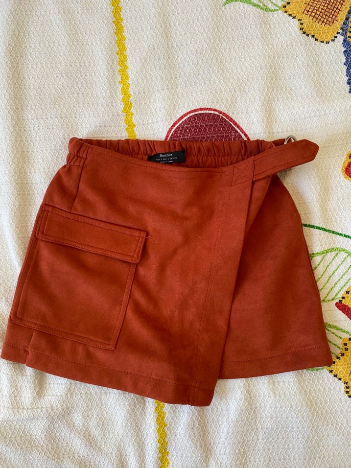 Kahverengi süet mini şort etek, kemerli. Kısa boyu ve ön cep detaylarıyla günlük kullanıma uygun.