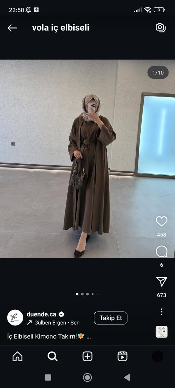 Kahverengi, ikili uzun elbise, yüksek yaka ve uzun kollu, iki parça, bol kesimle sade ve şık.