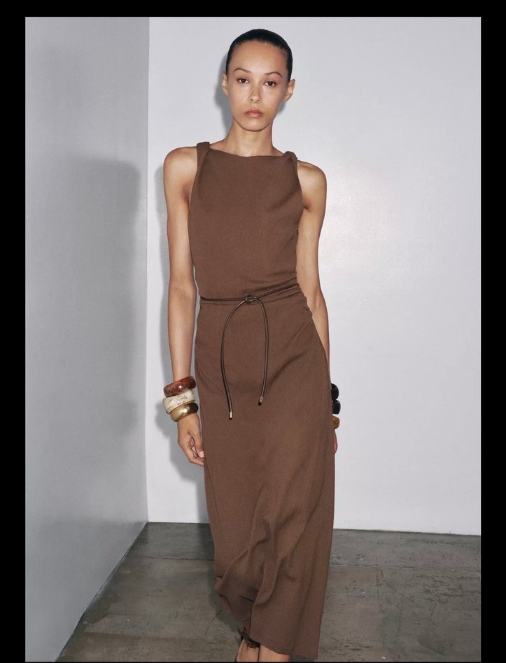 Kahverengi, kemerli ve kolsuz bu elbise, teknel yaka ve uzun kesime sahiptir. Günlük kullanım için yumuşak, ipeksi kumaştan yapılmıştır.