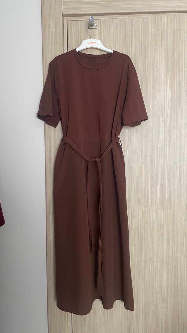 Kahverengi, kısa kollu, yuvarlak yakalı, kemerli uzun kadın elbisesi. Rahat kesimi ve yumuşak sentetik kumaşıyla günlük kullanıma uygundur.