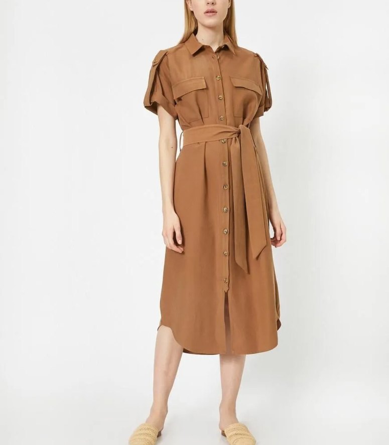 Kahverengi uzun elbise, yakalı ve kısa kolludur. Keten kumaştan yapılmış, bol kesim ve kemerli bel detayına sahiptir. Günlük kullanıma uygun, desensiz ve rahat bir modeldir.