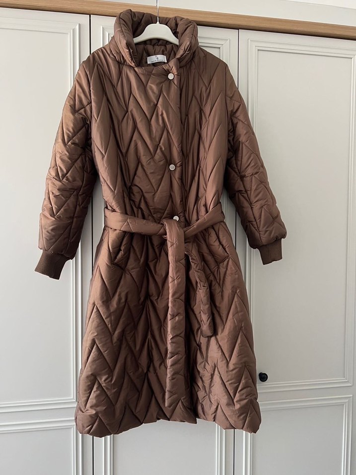 Kahverengi, kemerli ve uzun kesimli bu kışlık mont, notched lapel yakaya sahiptir. Gevşek kesim ve askılı kollara sahip, sentetik kumaştan yapılmıştır. ❄️ hiç giyilmedi butik ürünüdr