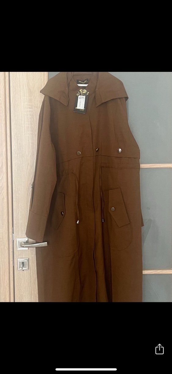 Kahverengi, kemerli ve uzun kesime sahip kadın trençkot. Yumuşak keten kumaştan, uzun kollu ve cepli, rahat sokak stili için uygundur.