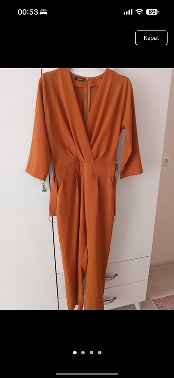 Kahverengi, kemerli ve notched lapel yakalı, askılı kollu, bol kesim kadın tulumu. İpeksi kumaştan üretilmiştir, günlük kullanıma uygundur.