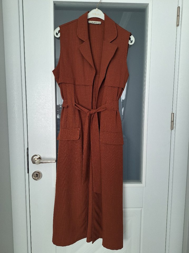 Kahverengi uzun kadın yelek, kemerli ve kesimli yakalıdır. Kolsuz, düz ve sentetik kumaştan yapılmıştır, ofis için uygundur.