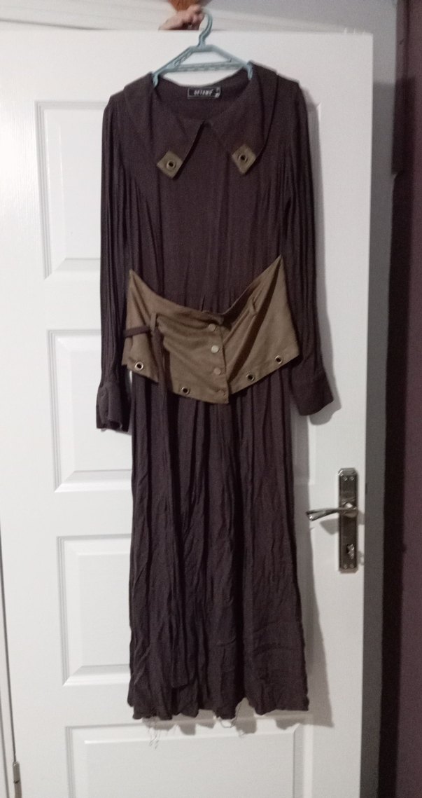 Kahverengi keten kumaştan, kemerli, notched lapel yakalı, uzun ve bol kesim elbise. Strappy kollu, goth ve avant-garde tarzda. markası setrems