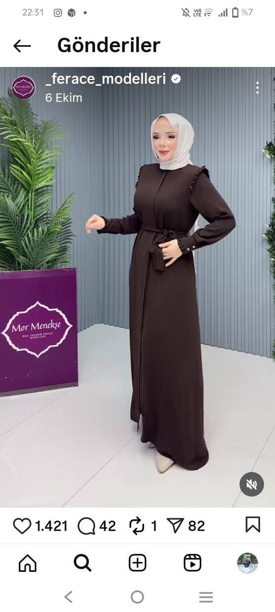 Kahverengi uzun ferace, yüksek yakalı ve uzun kolludur. Düz, yumuşak Medine ipeği kumaştan, kemerli ve düzenli kesimdir. Minimalist, sade ve günlük kullanıma uygundur.