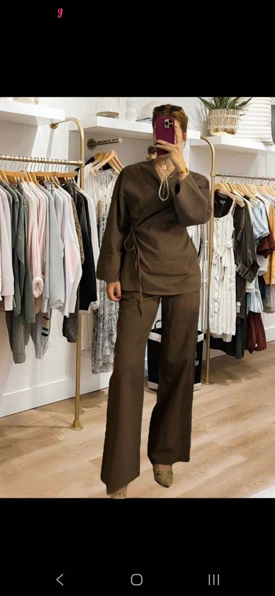 BEDENLER MEVCUTTUR.Kahverengi, yüksek yakalı ve uzun kollu kadın takımı. Yumuşak keten kumaştan, kemerli ve uzun paçalı, ofis için uygun.