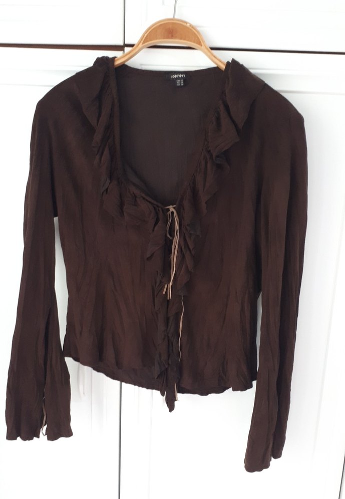Kahverengi keten bluz, uzun kollu, V yakalı ve kemerli. Normal boyda, bol kesim, desen içermeyen tasarımıyla ofis için uygun, gotik tarzda rahat bir parça.