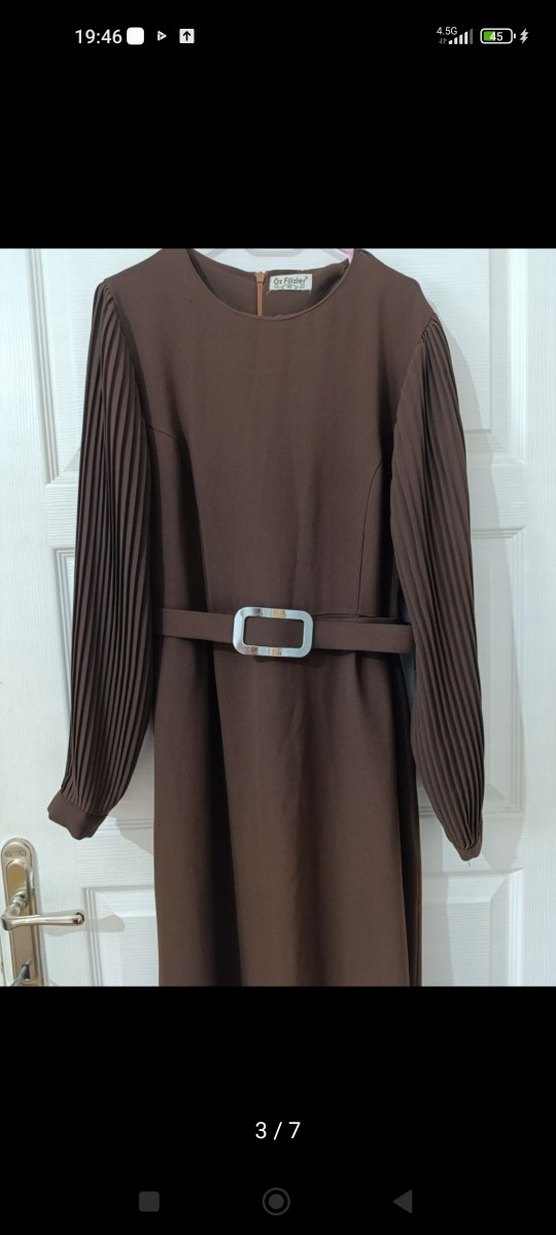 Kahverengi uzun elbise, pileli uzun kollara ve kemerli bele sahiptir. Yuvarlak yakalı ve regular fit olan elbise,