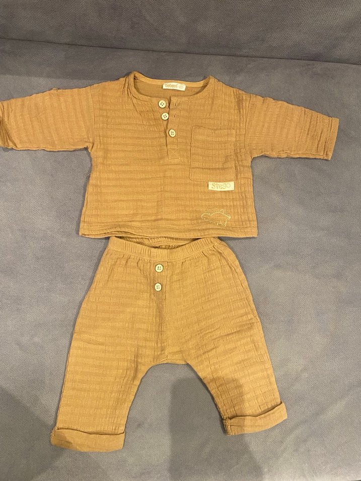 Koyu kahverengi keten kumaştan, düğmeli uzun kollu, yuvarlak yakalı üst ve pantolonlu bebek erkek takımı.