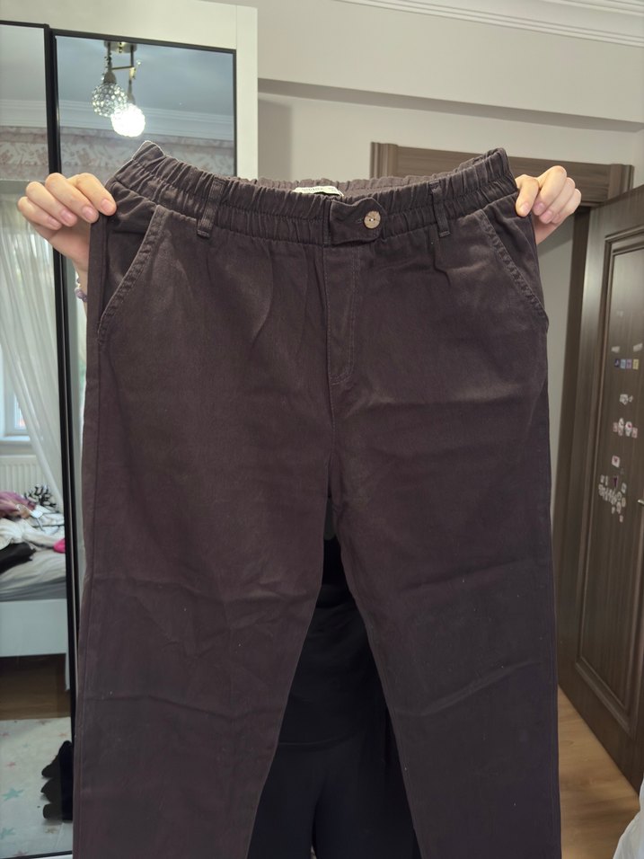 Kahverengi keten kumaştan, beli kemerli, midi boyda ve bol kesim rahat pantolon. Günlük kullanıma uygun, sokak stili rahatlığı sunar.