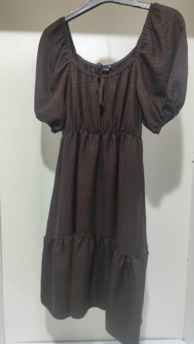 kahverengi keten elbise, fırfır detaylı , bohem tarzda. Günlük kullanıma uygun.