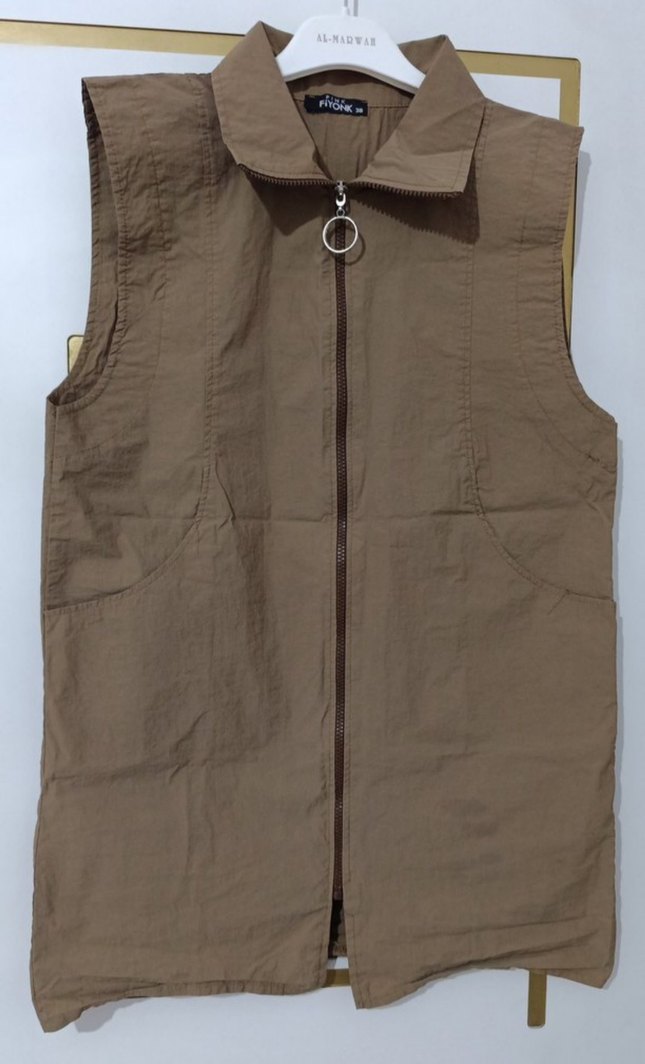Keten kumaştan, kahverengi renkli, fermuarlı ve yakalı kolsuz kadın paraşüt yelek. Normal uzunlukta, regular fit ve günlük rahat kullanıma uygun.