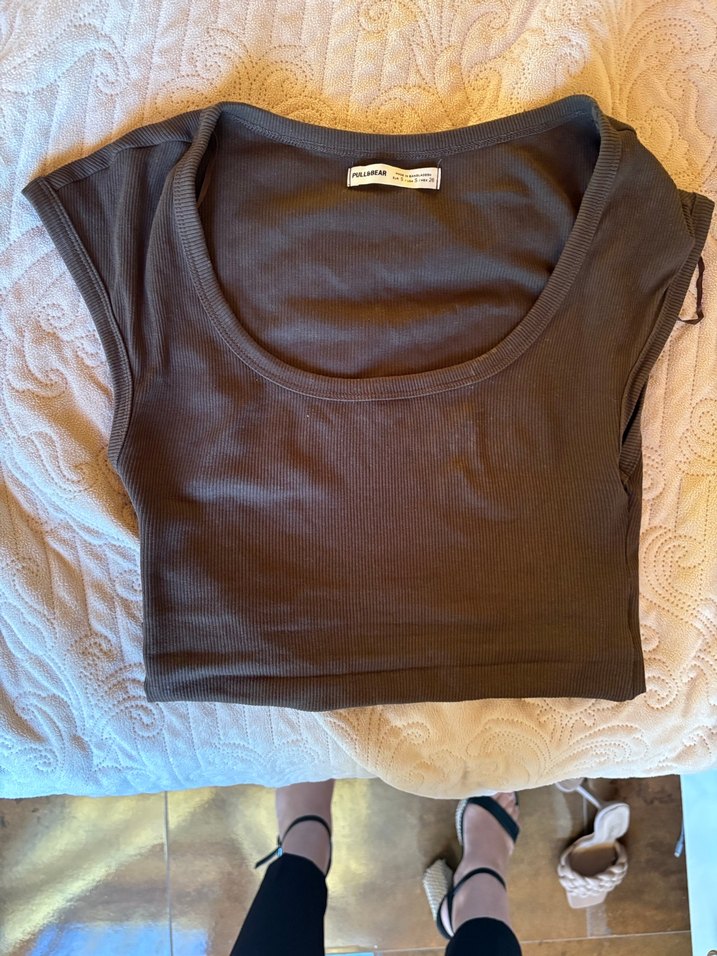 Kahverengi keten kumaştan, kısa kollu ve bisiklet yakalı, normal midi uzunlukta, minimal desenli hamile tişörtü. Günlük rahat kullanıma uygundur.