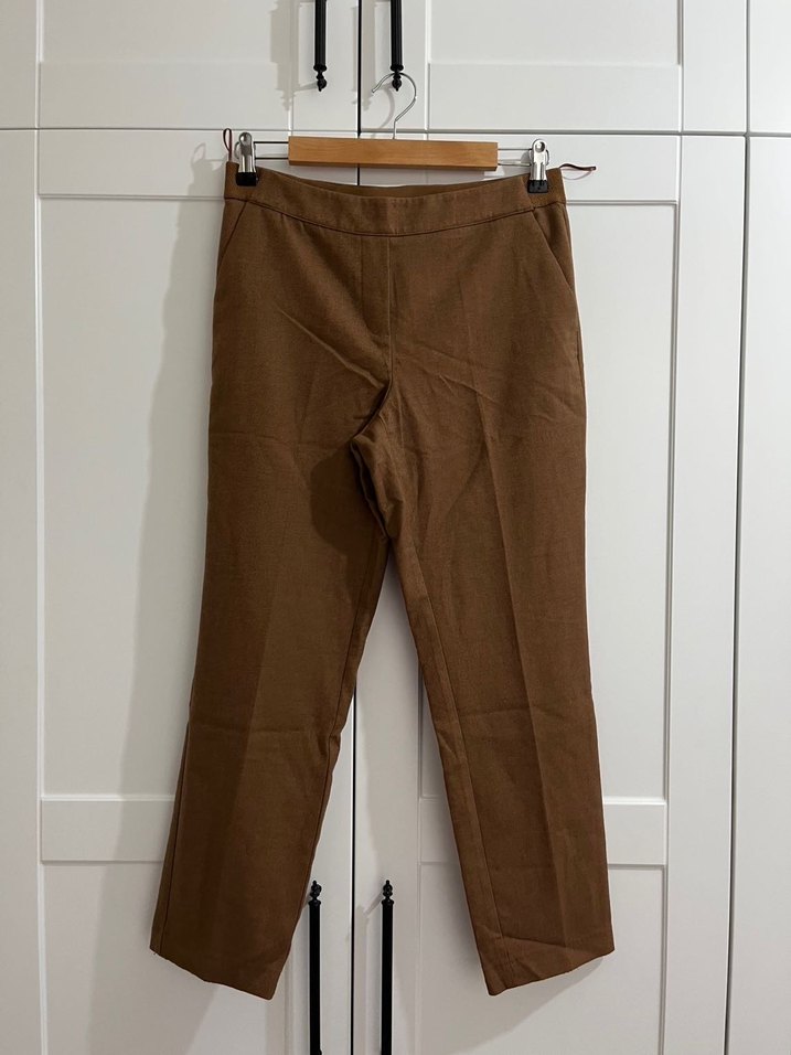 Kahverengi keten kumaştan yapılmış, midi boy, regular fit kadın pantolon. Minimalist ve normcore tarzda, ofis kullanımı için uygundur.