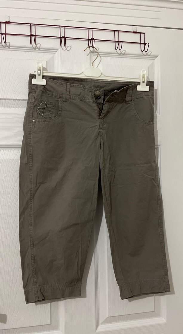 Kahverengi keten kumaştan, bol kesim ve kemerli, midi boy kadın pantolon. Günlük dış mekan kullanımı için uygundur.