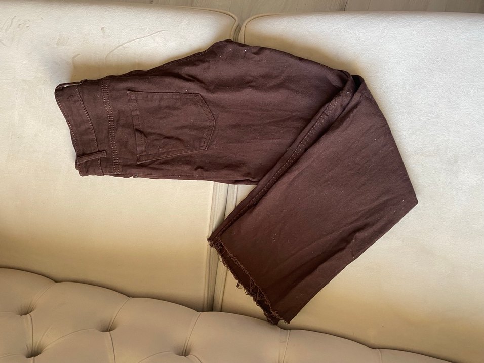 Kahverengi keten kumaştan, bol kesim ve desen içermeyen midi uzunlukta kadın pantolon. Günlük kullanım için rahat ve sade bir şıklık sunar.