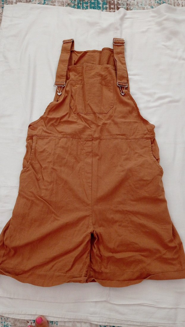 Kahverengi keten, askılı, bol kesim kadın midi salopet. Parlak görünümlü, tokalı askıları ve yuvarlak yaka detayı bulunur. Günlük kullanıma uygundur.