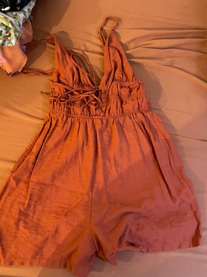 Keten kumaştan, kahverengi, bol kesim midi tulum. Drapeli tasarımlı, askılı ve halter yaka detaylıdır. Bohem tarzı için uygundur.
