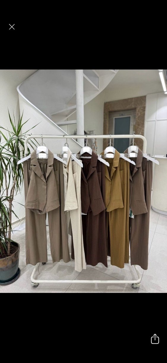 Kahverengi keten kumaştan, kolsuz ve kesik yaka detaylı, uzun paça ve rahat kesim kadın takımı, zahmetsiz şıklık sunar. Kahverengi ve yeşil renk mevcuttur
