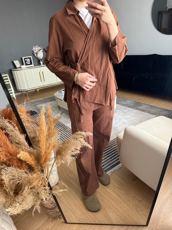 Kahverengi keten kumaştan, normal boy ve regular fit kesime sahip kadın takım elbise. Notlu yaka ve uzun kollu, desen içermeyen rahat ve şık tasarım.