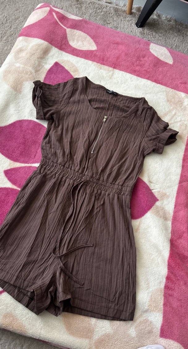 Kahverengi keten, kısa kollu, önü fermuarlı, V yakalı, rahat kesim kadın tulumu. Belinde bağcık detayı bulunur, günlük kullanıma uygundur.