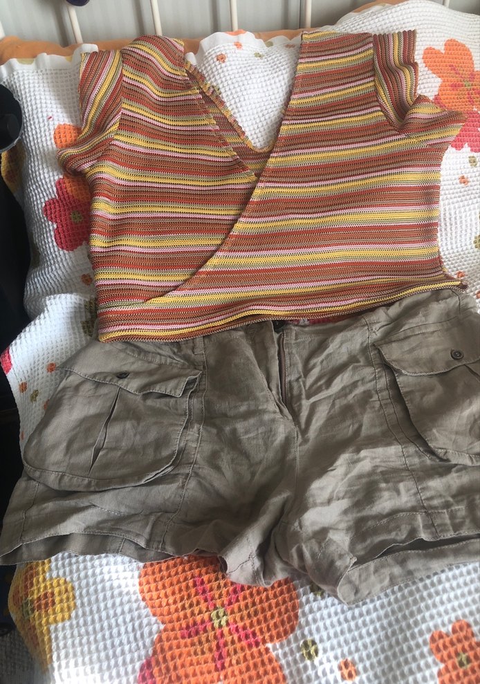 Kahverengi keten kumaştan, kemerli ve bol kesim mini şort. Rahat ve nefes alabilir, günlük dış mekan kullanımı için uygundur. Bluzla birlikte gönderim yapılacaktır