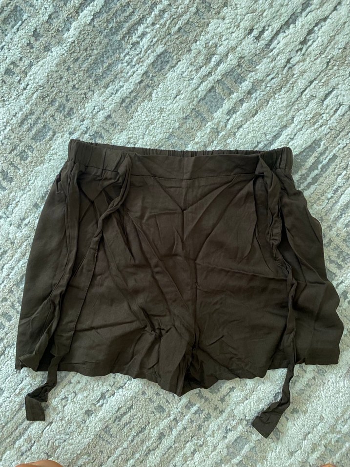 Yumuşak keten kumaştan, kemerli bel ve bol kesimli kahverengi mini şort. Desensiz, günlük sokak stili için uygundur.