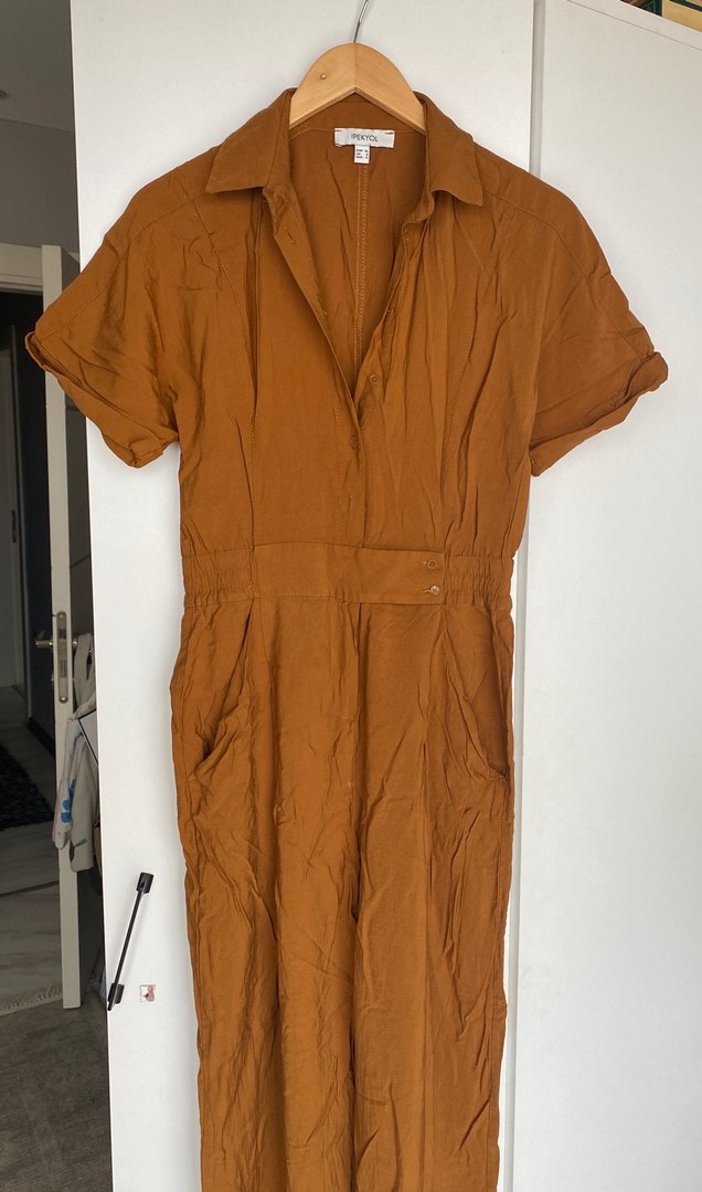 Kahverengi keten kumaştan, kısa kollu, yakalı ve kemerli bel detaylı bol kesim tulum. Minimalist tarzda, ofis kullanımı için uygundur.