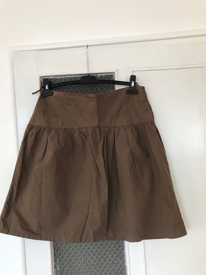 Kahverengi keten hamile eteği, rahat kesimi ve kemerli beliyle günlük kullanıma uygun şık bir seçenektir. Midi boyu ve sade deseni minimalist bohem tarzını yansıtır.