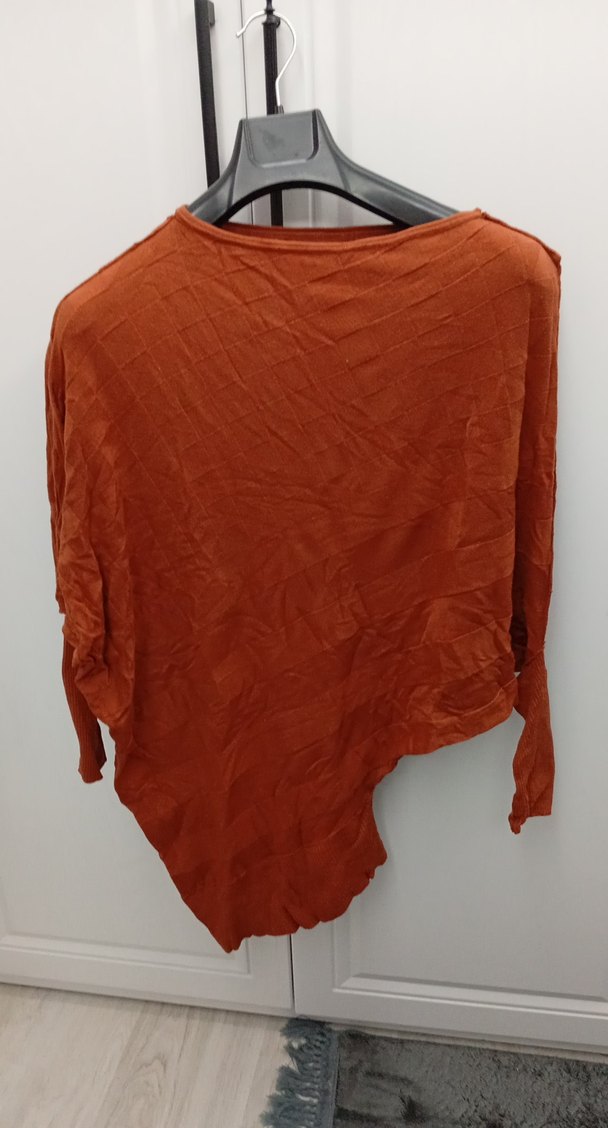 Kahverengi keten kadın kazağı, uzun kollu ve yuvarlak yakalı drapeli tasarıma sahiptir. Salaş kesimi ve parlak dokusuyla günlük kullanıma uygundur.