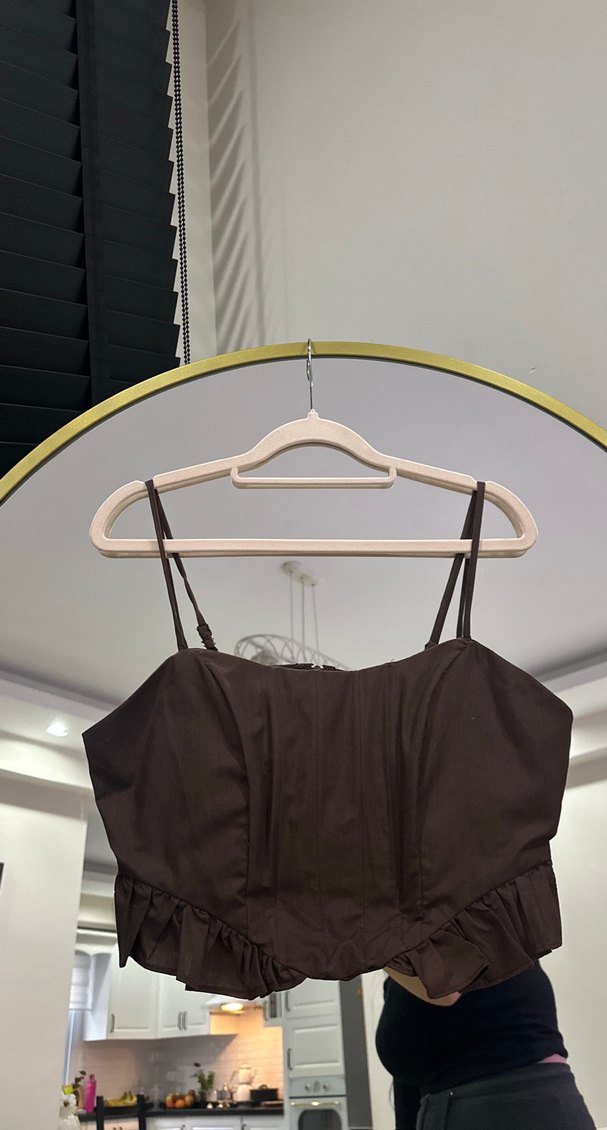 Kahverengi keten, ince askılı, oturan kesim ve fırfırlı etek ucu ile minimal ve gotik tarzı birleştiren günlük kullanıma uygun büstiyer.