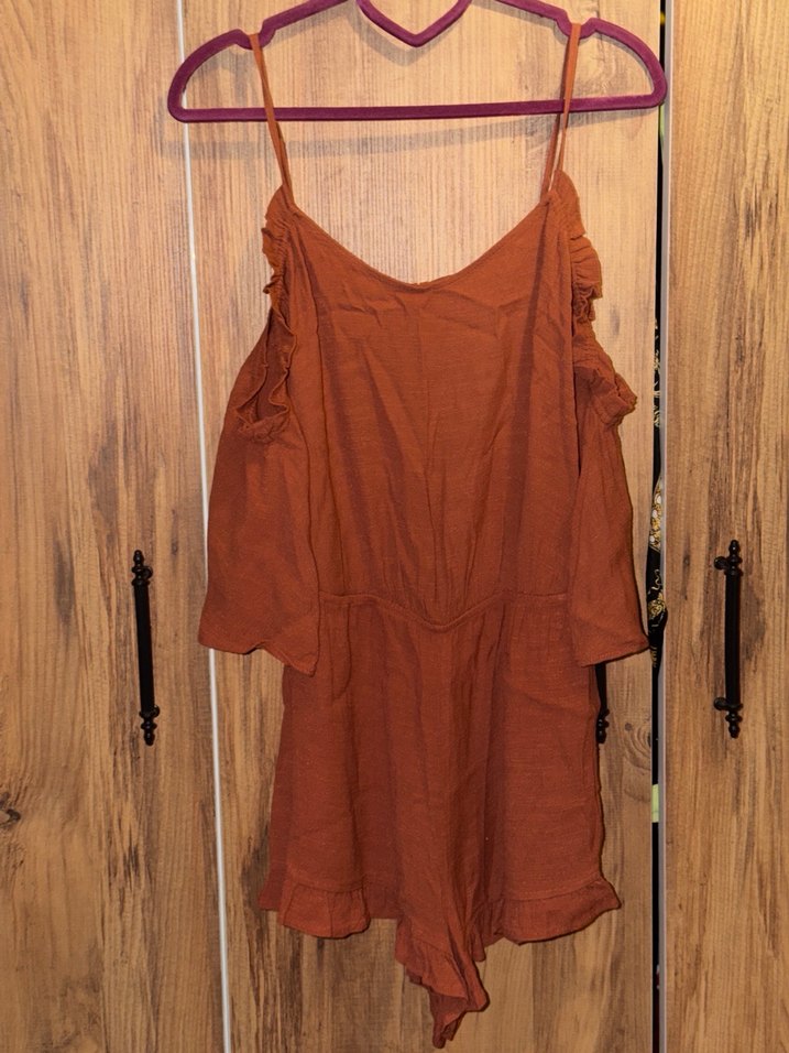Kahverengi keten kumaştan, volan detaylı, askılı ve kol kısmı açık, bol kesim midi boy kadın tulum. Bohem tarzı için uygun.
