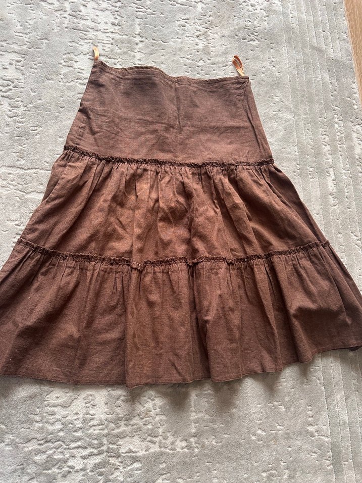 Kahverengi keten kumaştan, bol kesim ve volan detaylı midi uzunlukta bohem tarzda günlük etek. 36 beden