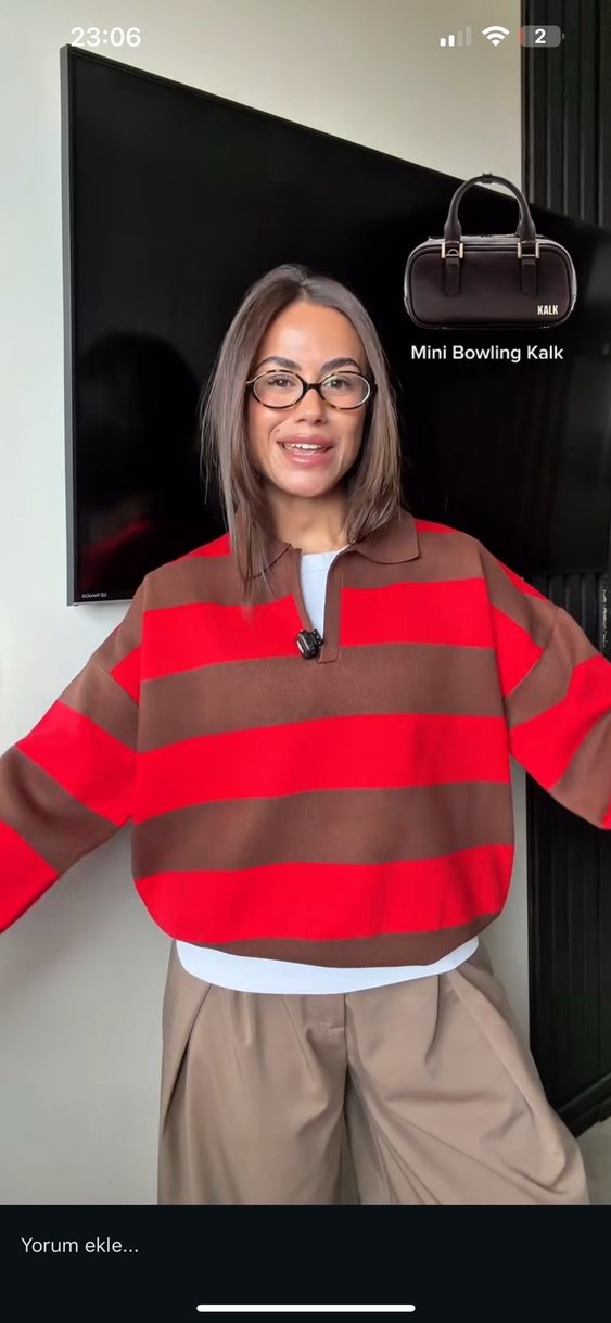 Bu triko kazak, bol kesim, uzun kollu ve yakalı tasarıma sahiptir. Kahverengi ve kırmızı geniş çizgilerle günlük sokak stiline uygundur.