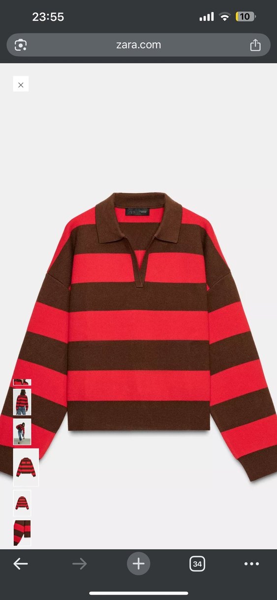 Kadınlar için uzun kollu, yakalı, kahverengi ve kırmızı çizgili triko yün kazak. Salaş kesimiyle günlük rahat sokak stili sunar.