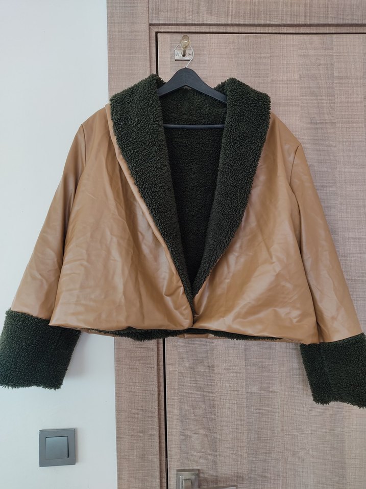 Kahverengi kısa deri ceket, kürk detaylı yakası ve bol kesimiyle dikkat çeker. Uzun kollu ve içi sıcak tutan kumaşlıdır, sokak modasına uygundur 40 beden uzunluk boyu 50 santimdir,